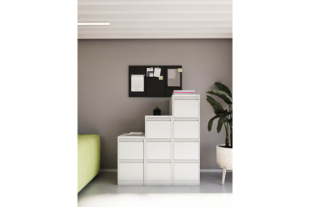 Шкаф оснащён четырьмя выдвижными ящиками, установленными на шариковых направляющих полного выдвижения. Это позволяет полностью использовать глубину ящиков, легко просматривать содержимое и обеспечивать быстрый доступ к документам. Каждый ящик выдерживает нагрузку до 30 кг, а благодаря встроенной планке-держателю папок формата A4 документы всегда остаются аккуратно организованными. Сборная конструкция ящика выполнена из стальных деталей толщиной 0,4–0,5 мм и имеет безопасные загибы по кромкам.