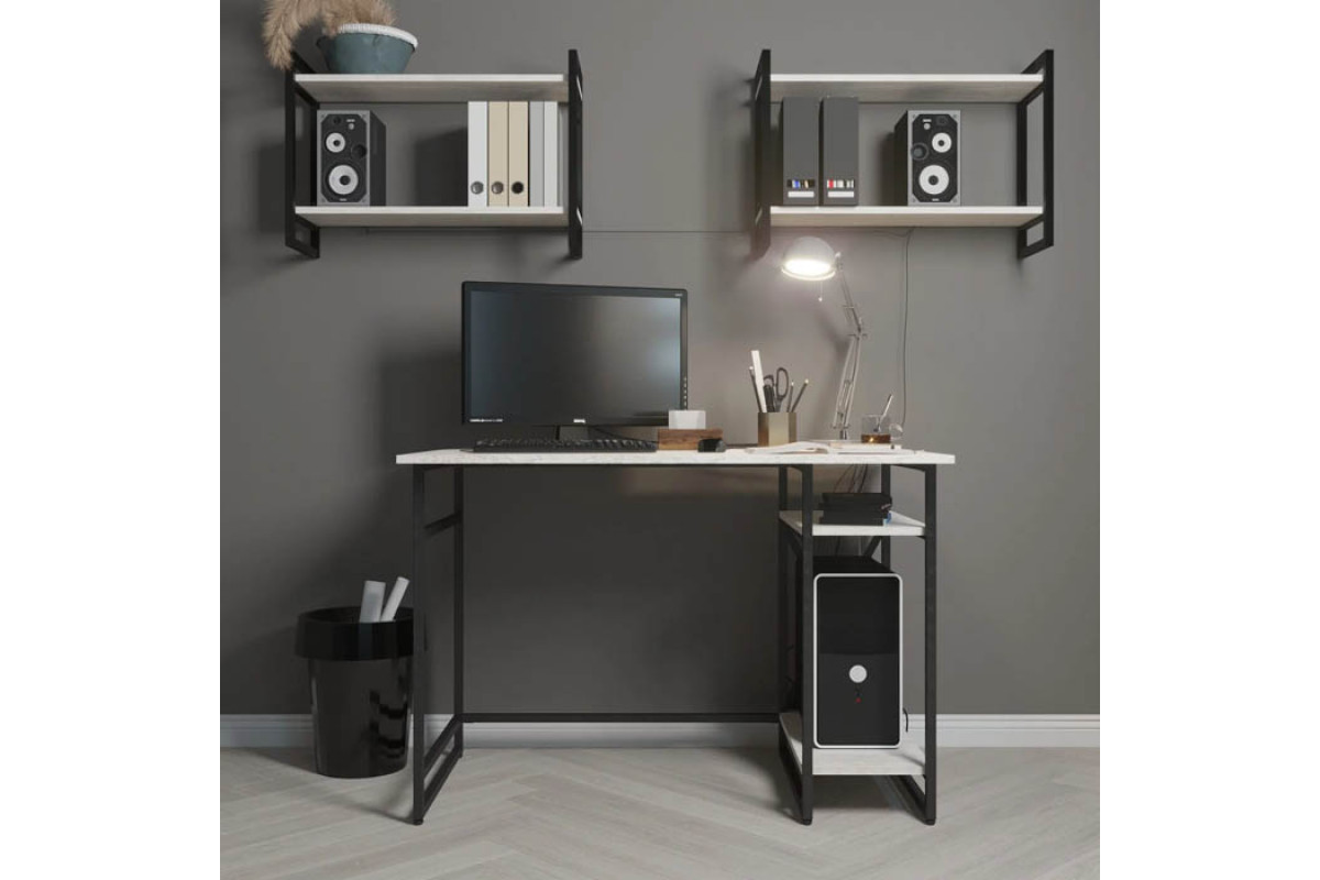 Письменный стол GUTTA — это стильное решение для вашего рабочего пространства. Он выполнен в стиле лофт и имеет размеры 76х111х68 см, что позволяет комфортно разместить все необходимые вещи. Каркас стола изготовлен из качественной конструкционной стали и окрашен в черный или белый цвет. В комплект входят две полки из ЛДСП, которые могут быть коричневого, патинированного или эвок цвета.