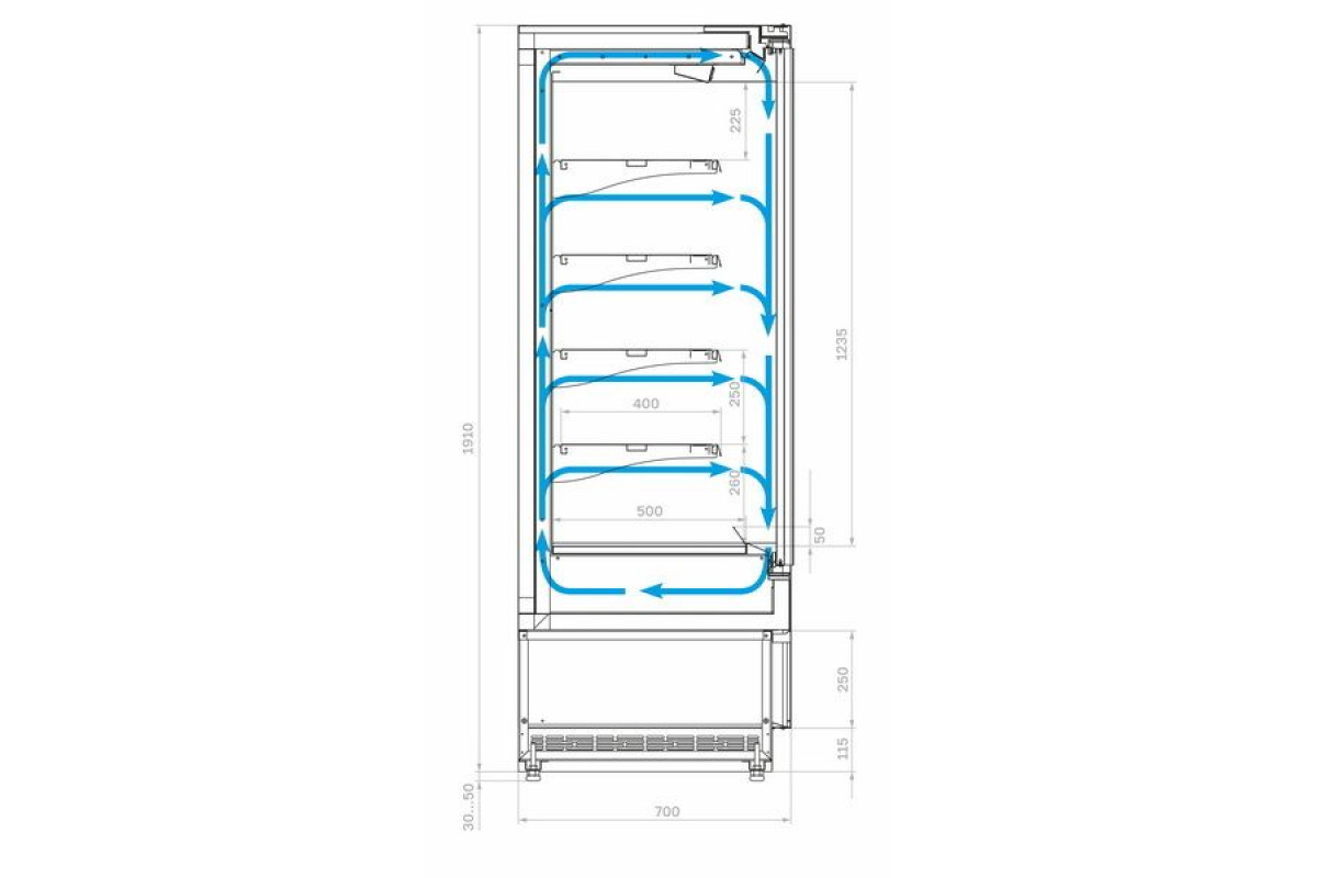 - Просвет между задней стенкой витрины и стеной помещения должен быть не менее 0,25 м;