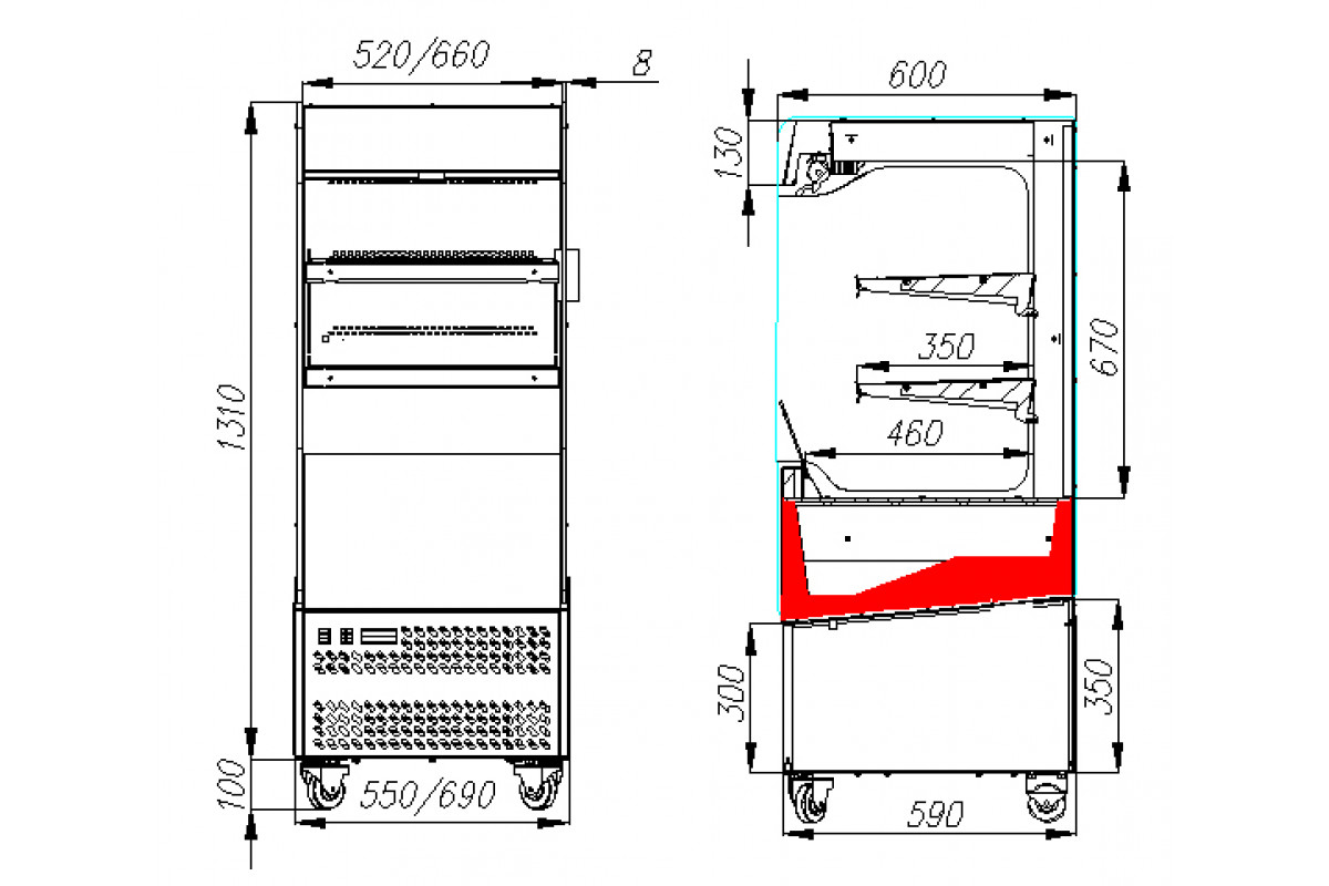 - Колесные опоры h-100 мм, что обеспечивает мобильность витрины;