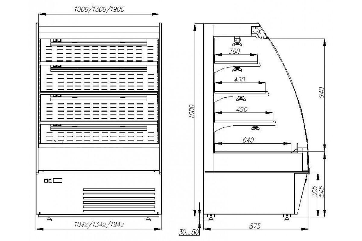- регулируемые по высоте и наклону полки имеют ширину 360/430/490 мм;