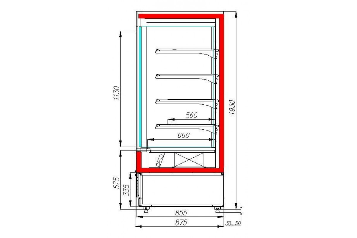 Внутри размещено 4 ряда полок и широкая базовая полка. Глубина навесных полок 500 мм. Они идут с кронштейнами, могут изменять положение высоты и наклона. В боковой части установлена LED-лента, создающая эффектное освещение всей экспозиции. Встроенное в нижнем отсеке холодообеспечение (импортный компрессор) снимает трудности установки. Предусмотрен защитный бампер. Климатическое исполнение — класс 3.