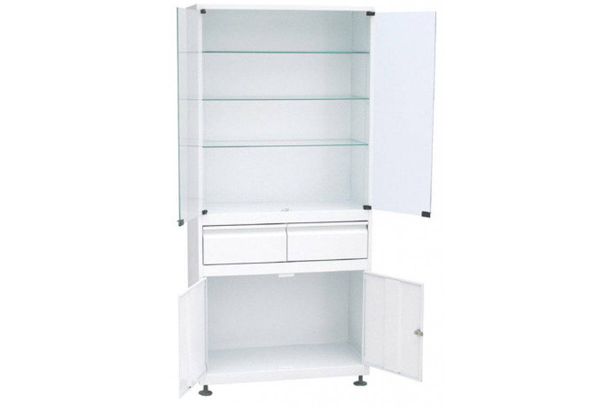 Шкаф 2-ух створчатый стекло/металл ШМС-2-Р-2 с регулируемыми опорами с 2-мя выдв ящиками