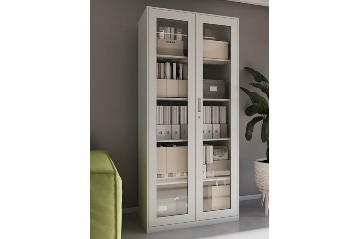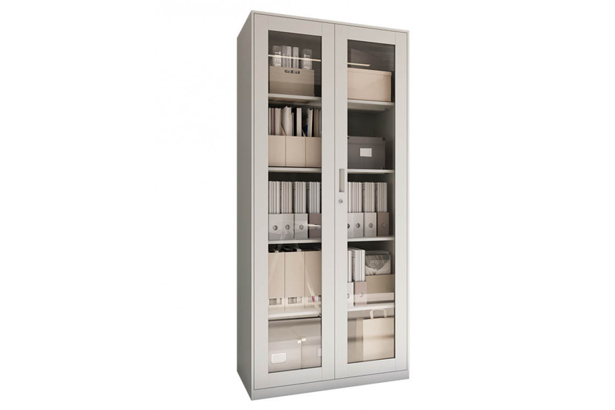 Двери имеют стальную раму со стеклянными вставками иззакалённого прозрачного стекла толщиной 4 мм. Содержимое шкафа хорошовидно, что упрощает поиск нужных документов и визуальный контроль порядка.