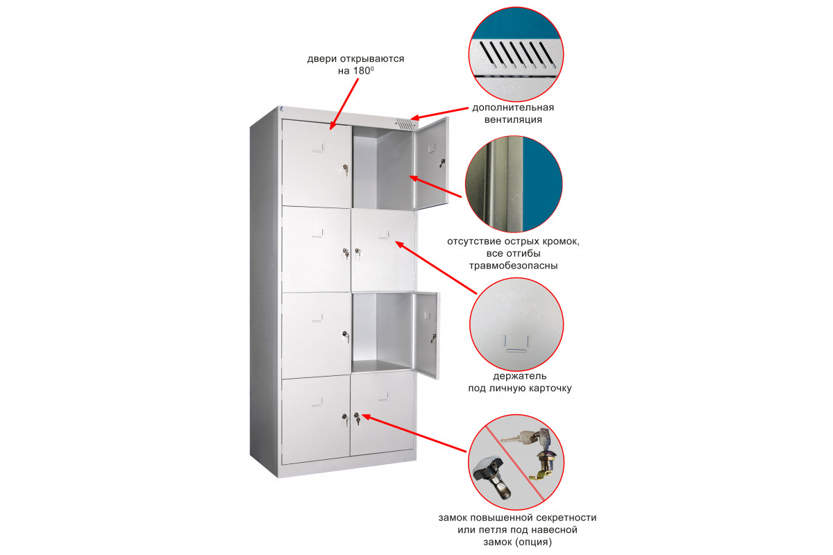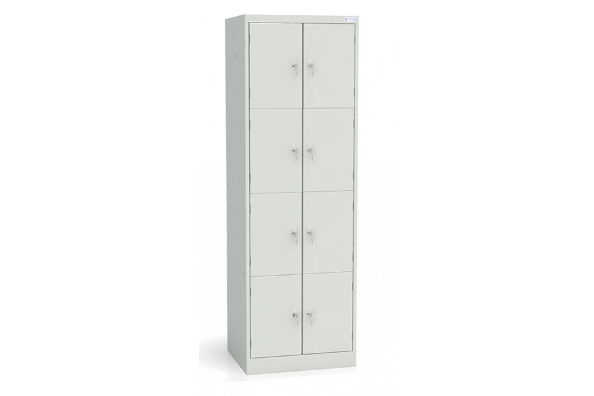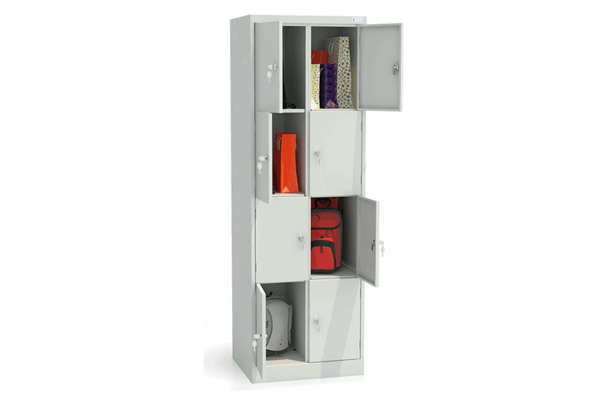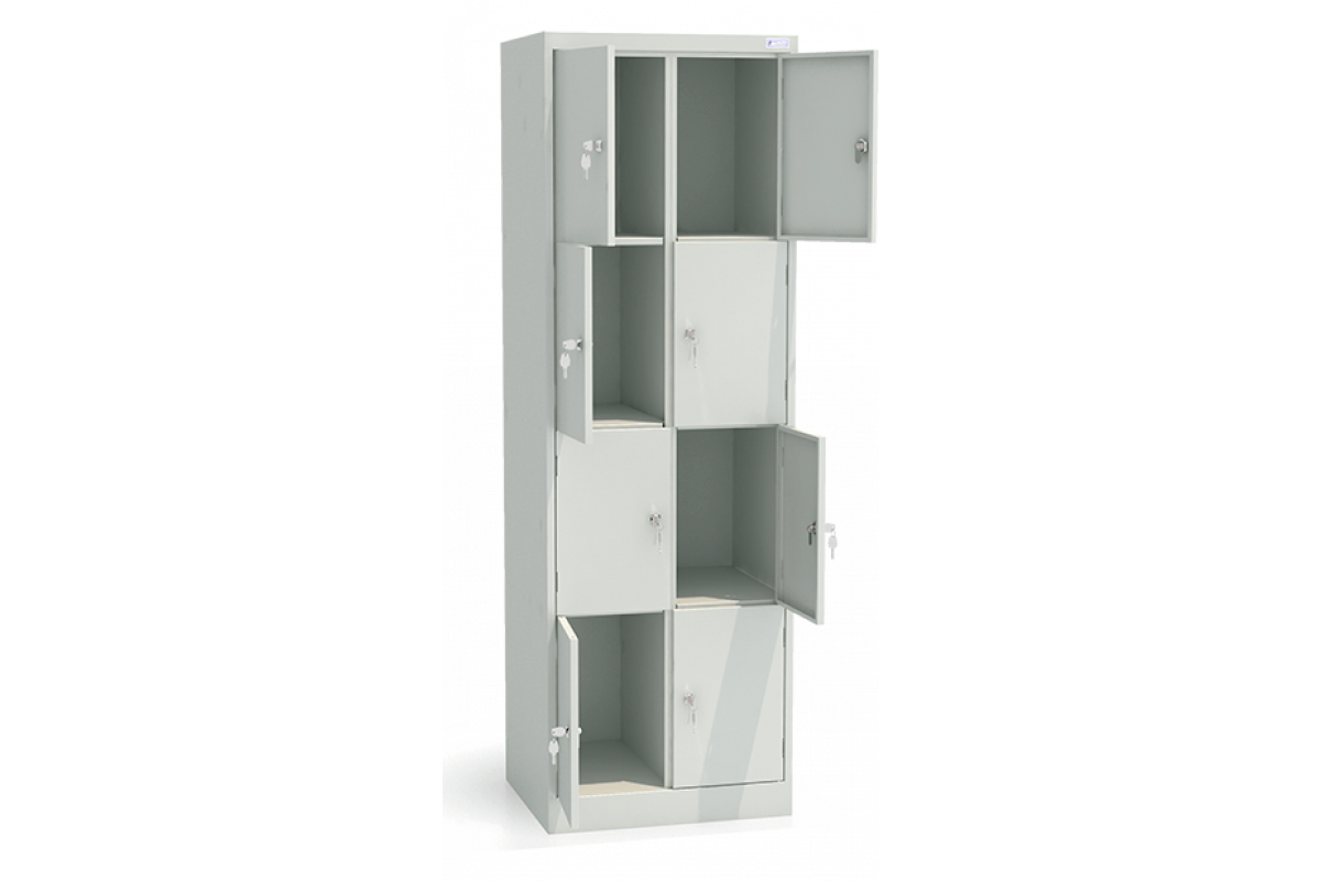 Восемь ячеек, каждая ячейка оборудована индивидуальным замком "Euro-Locks", в комплекте 8 замков