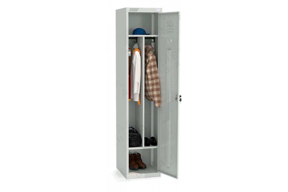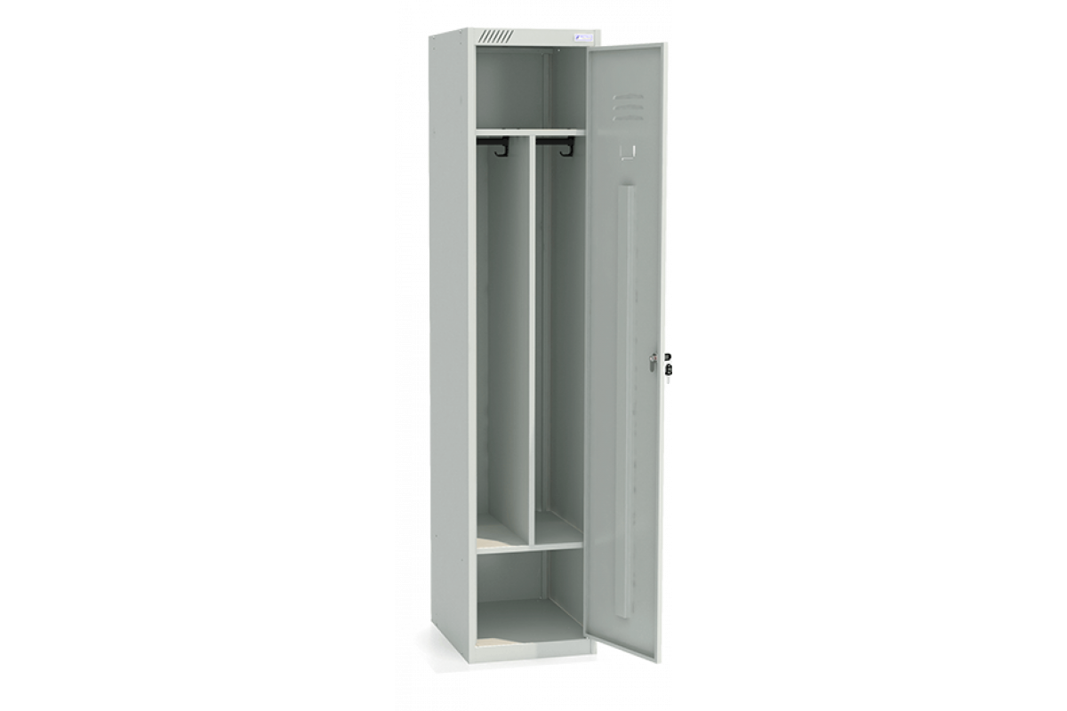 - Комплектуется вертикальной перегородкой, общей полкой для головных уборов, полкой для обуви, 4 крючками, 2 перекладинами, 1 замком повышенной секретности.