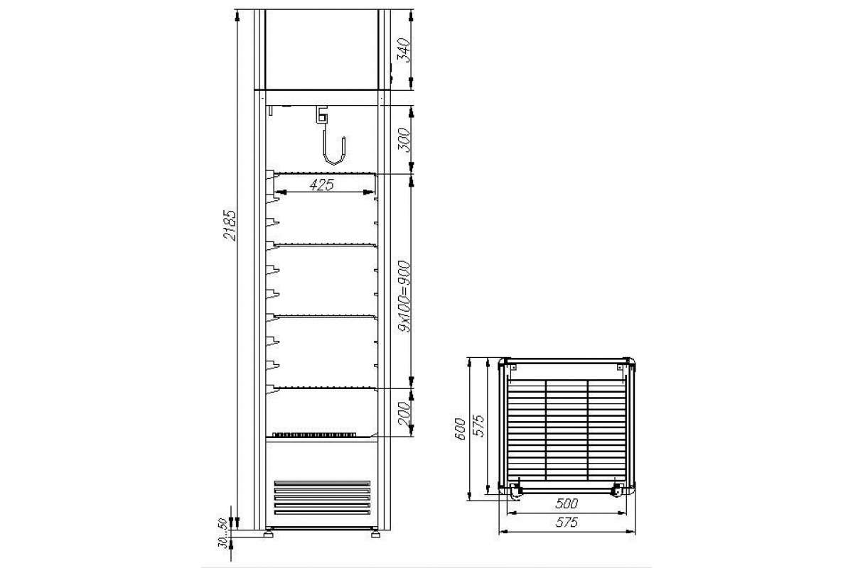 Внутренняя часть и каркас рабочей камеры шкафа выполнены из нержавеющей стали. По ее углам установлена вертикальная LED-подсветка. Камера комплектуется 4-мя решетчатыми стальными полками и подвесом с 2-мя крюками. Содержимое охлаждается динамическим способом за счет расположенного снизу агрегата и встроенного в камеру вентилятора.