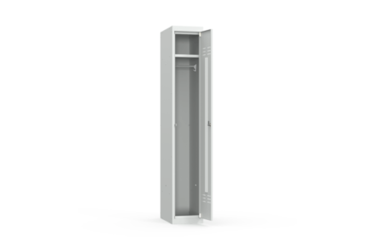 Односекционный металлический шкаф для одежды имеет внутреннюю комплектацию: полку для головных уборов, металлическую перекладину для вешалок и два пластиковых крючка для одежды, проушину для навесных замков. Размер секций обеспечивает комфортное размещение верхней одежды, в том числе зимней. Конструкция предусматривает возможность установки дополнительной полки для обуви.