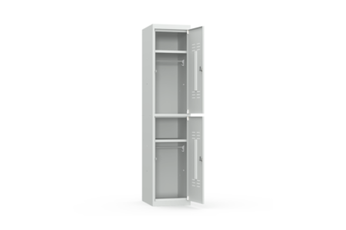 двухсекционный металлический шкаф для одежды имеет две ячейки с индивидуальными замками,