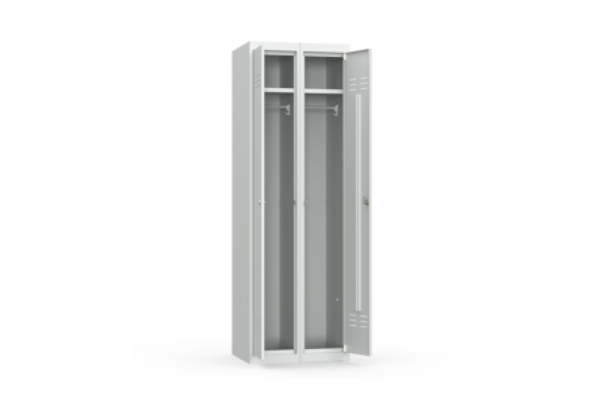 Шкаф имеет две секции, каждая из которых оснащается полкой для головных уборов, металлической перекладиной для вешалок и двумя пластиковыми крючками для одежды, проушиной для навесных замков. Размер секций обеспечивает комфортное размещение верхней одежды, в том числе зимней. Конструкция предусматривает возможность установки дополнительной полки для обуви.