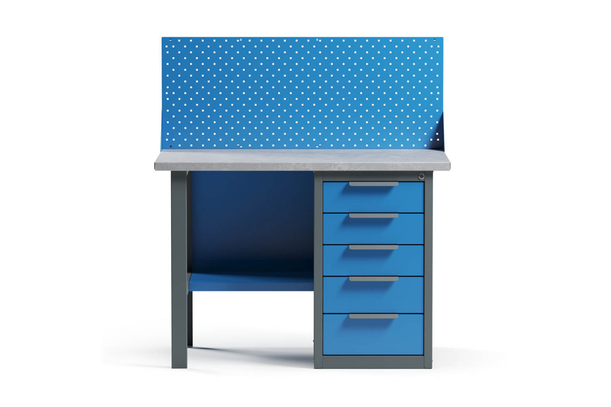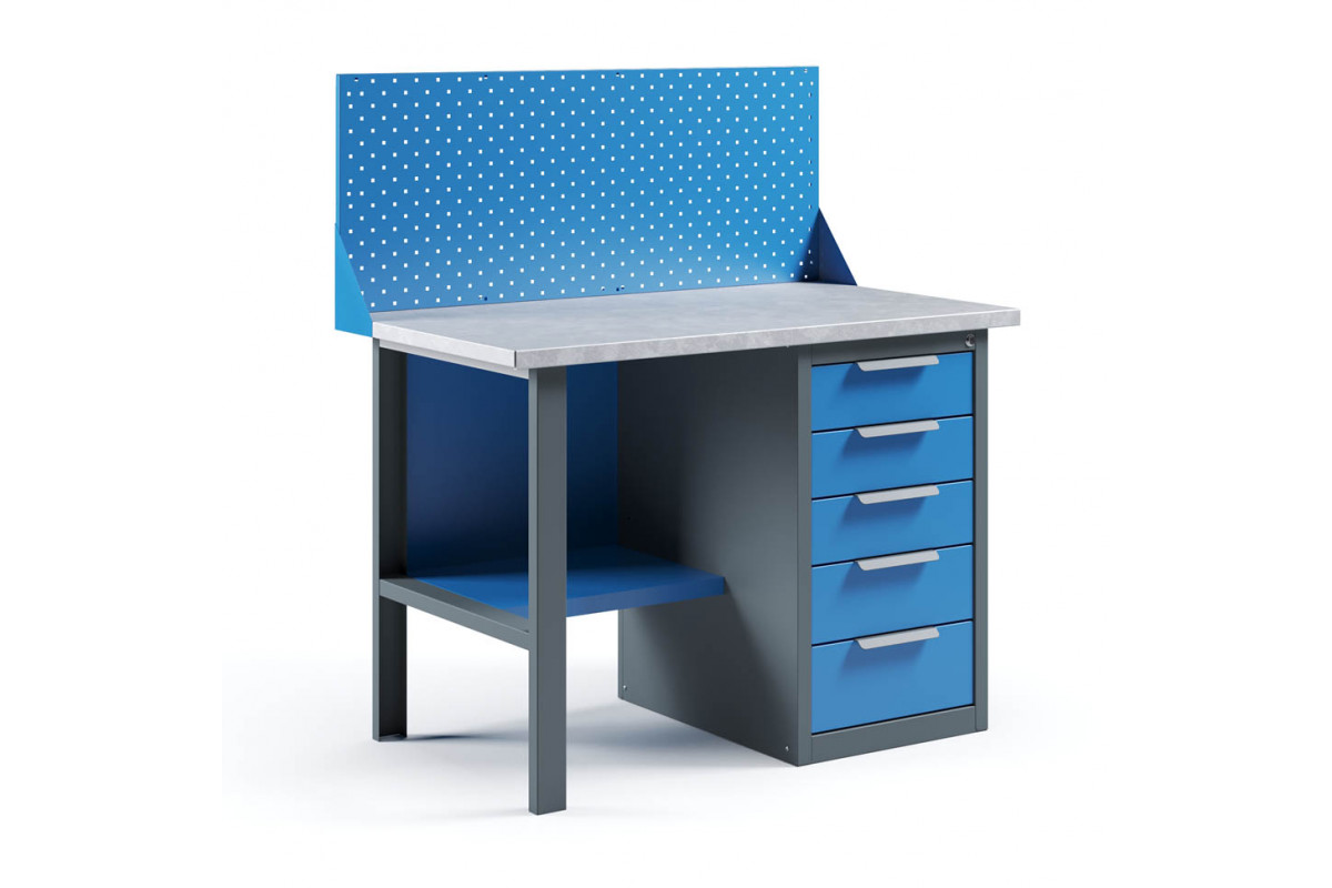 - Верстак укомплектован драйвером с пятью выдвижными ящиками разными по высоте и тумбой с полками.