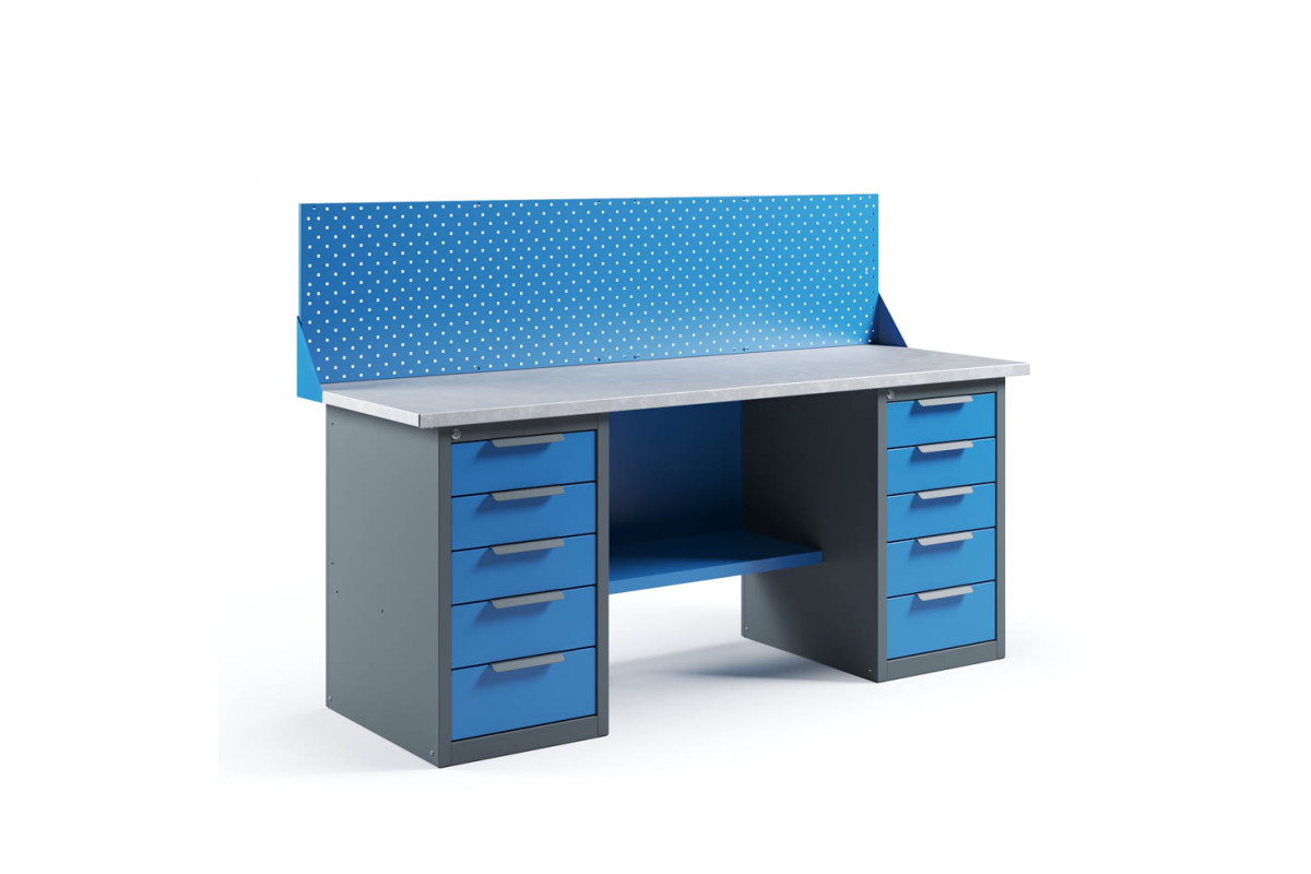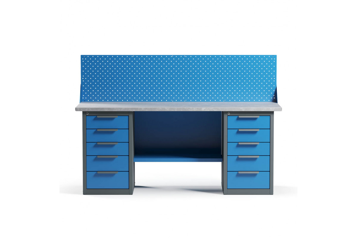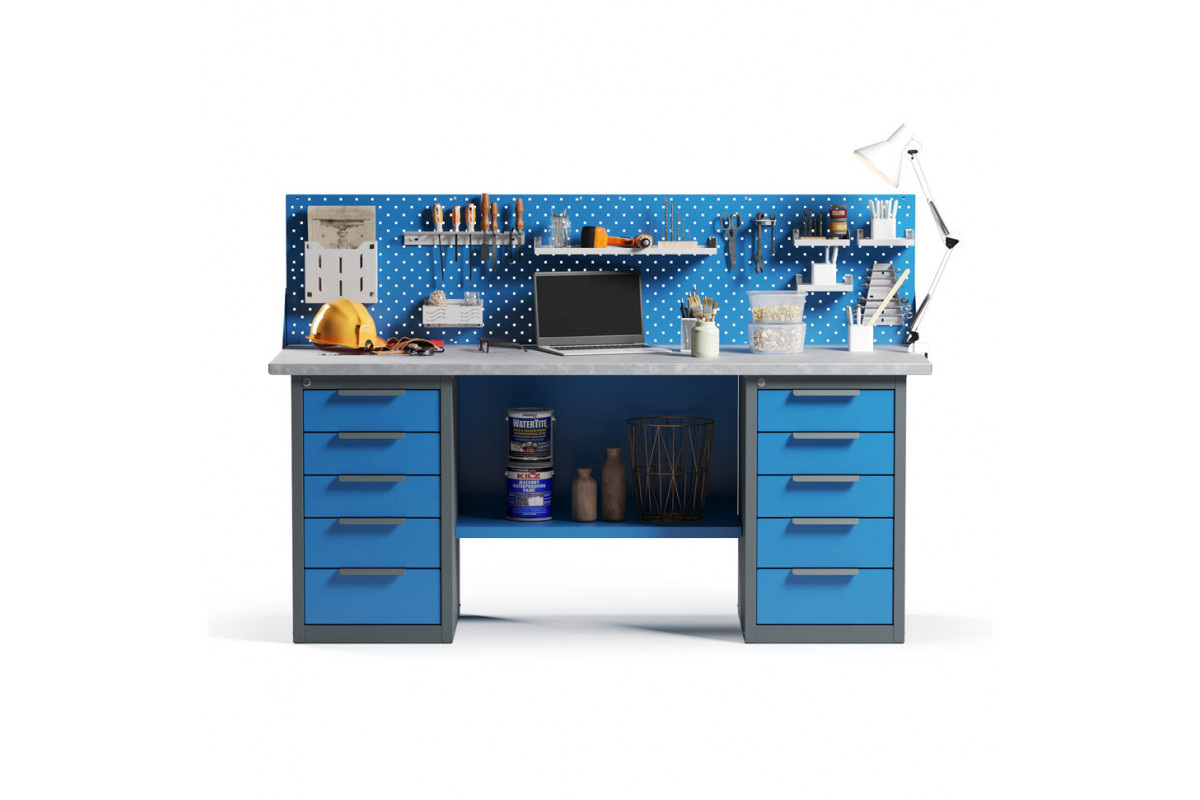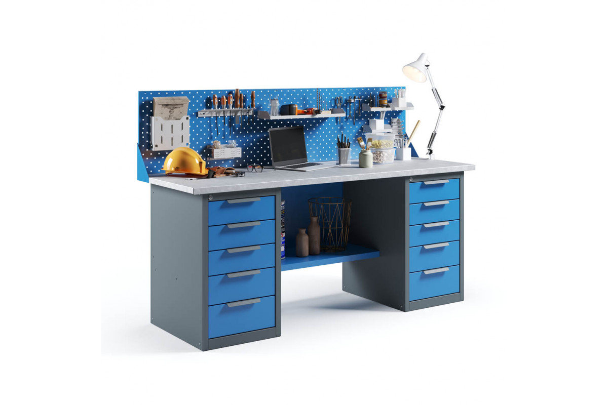 - Верстак укомплектован двумя драйверами, каждый из которых оснащен пятью выдвижными ящиками разными по высоте.