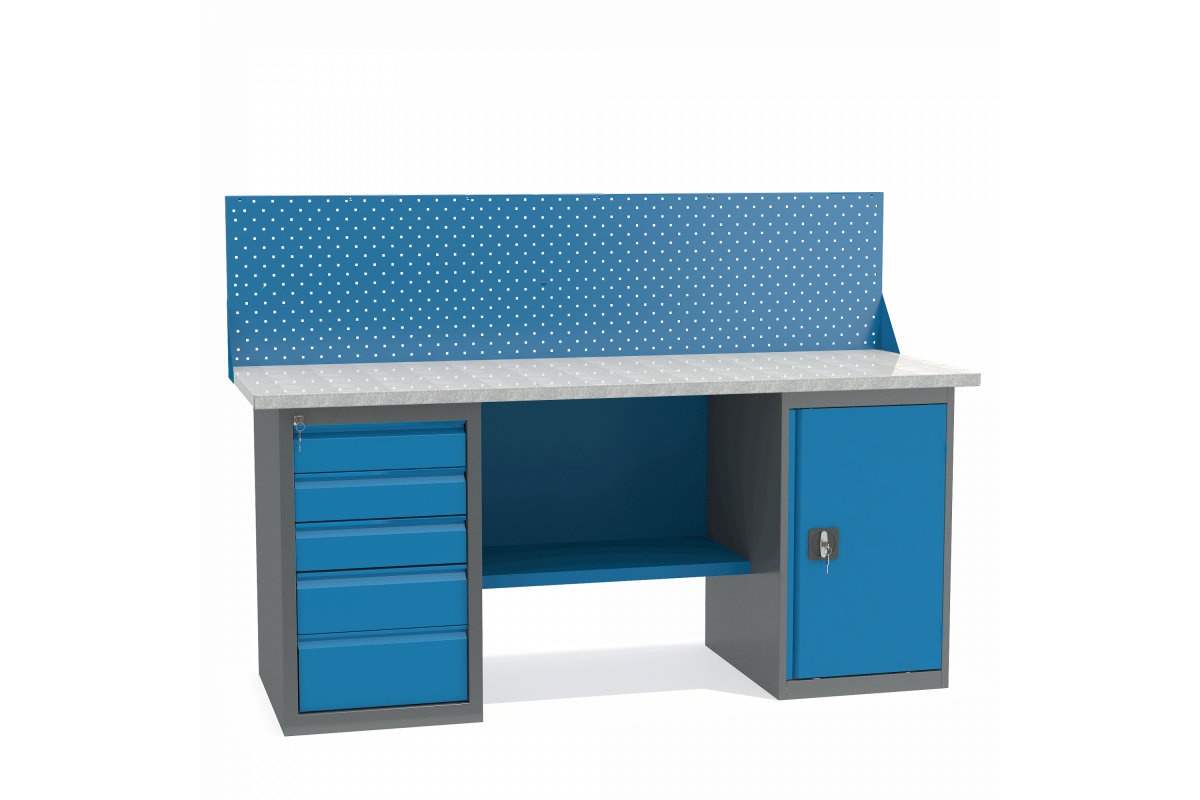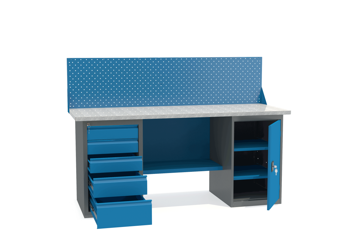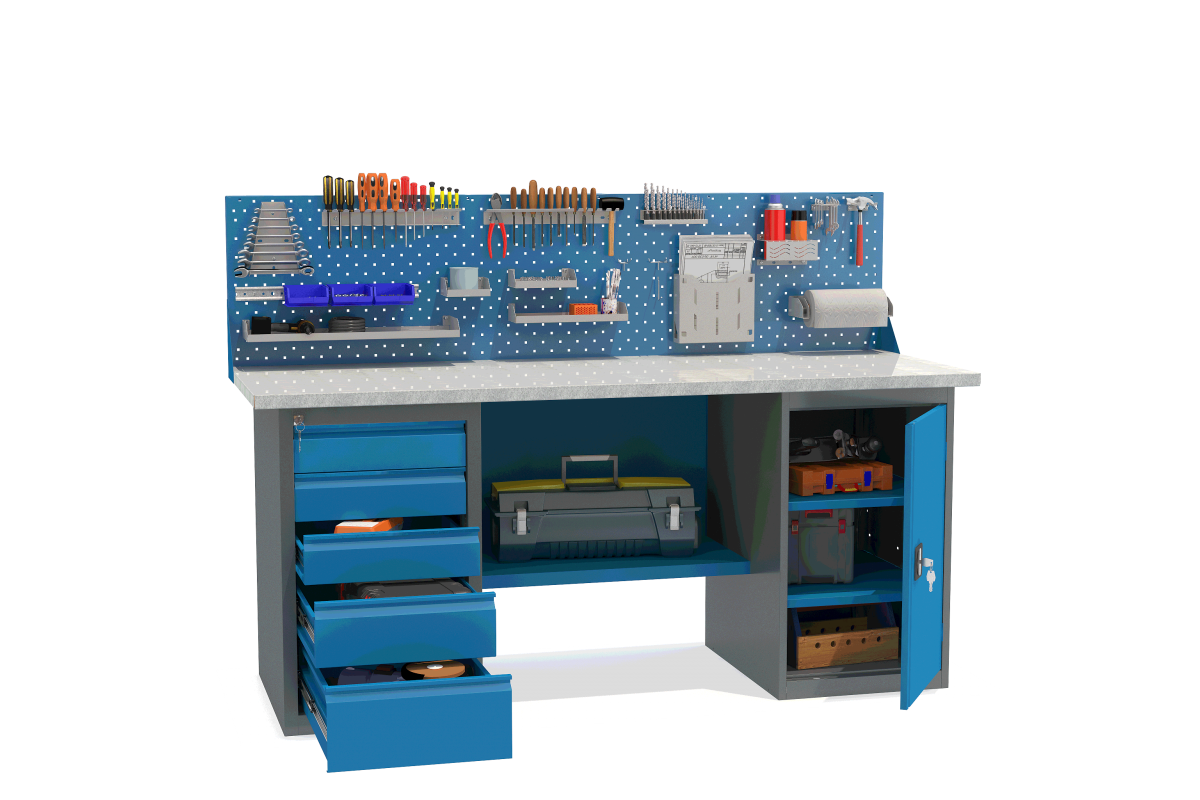 - Верстак укомплектован драйвером с пятью выдвижными ящиками разными по высоте и тумбой с полками.