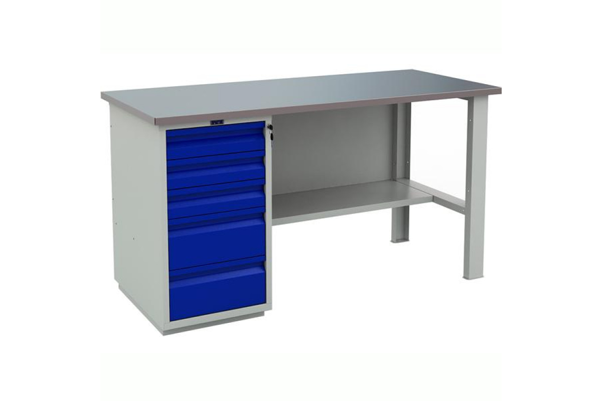 Верстак состоит из тумбы WD5 и опоры F1 .Тумба укомплектована 5-ю выдвижными ящиками. Ящики открываются на телескопических направляющих. Нагрузка на ящик 30 кг.Все ящики закрываются на центральный ключевой замок.