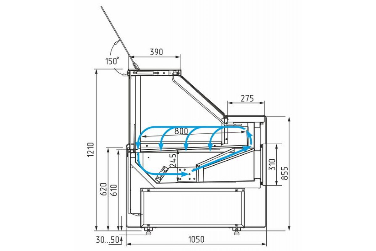 Отдельностоящая витрина приобретается только вместе с боковинами. При заказе нескольких витрин с одинаковым температурным режимом для установки в линию достаточно заказать 2 боковины на всю линию.