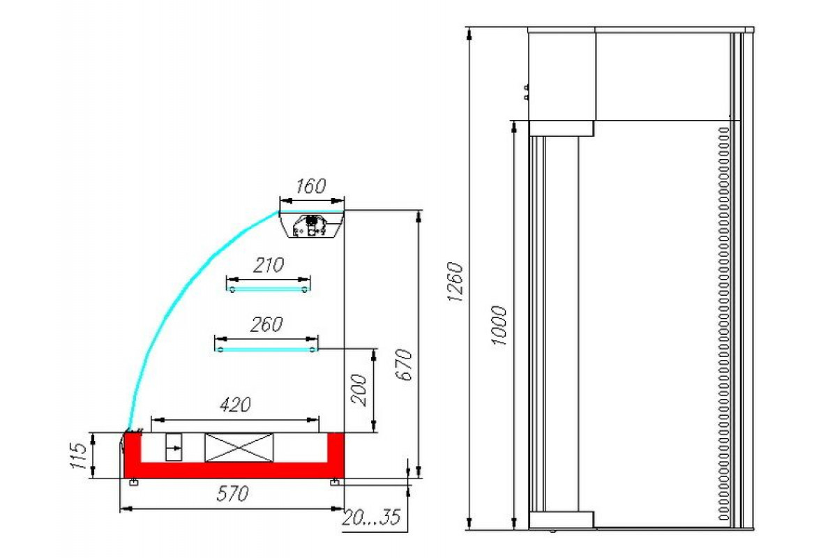- Глубина выкладки 420 мм + 2 стеклянные полки 210 мм и 260 мм;