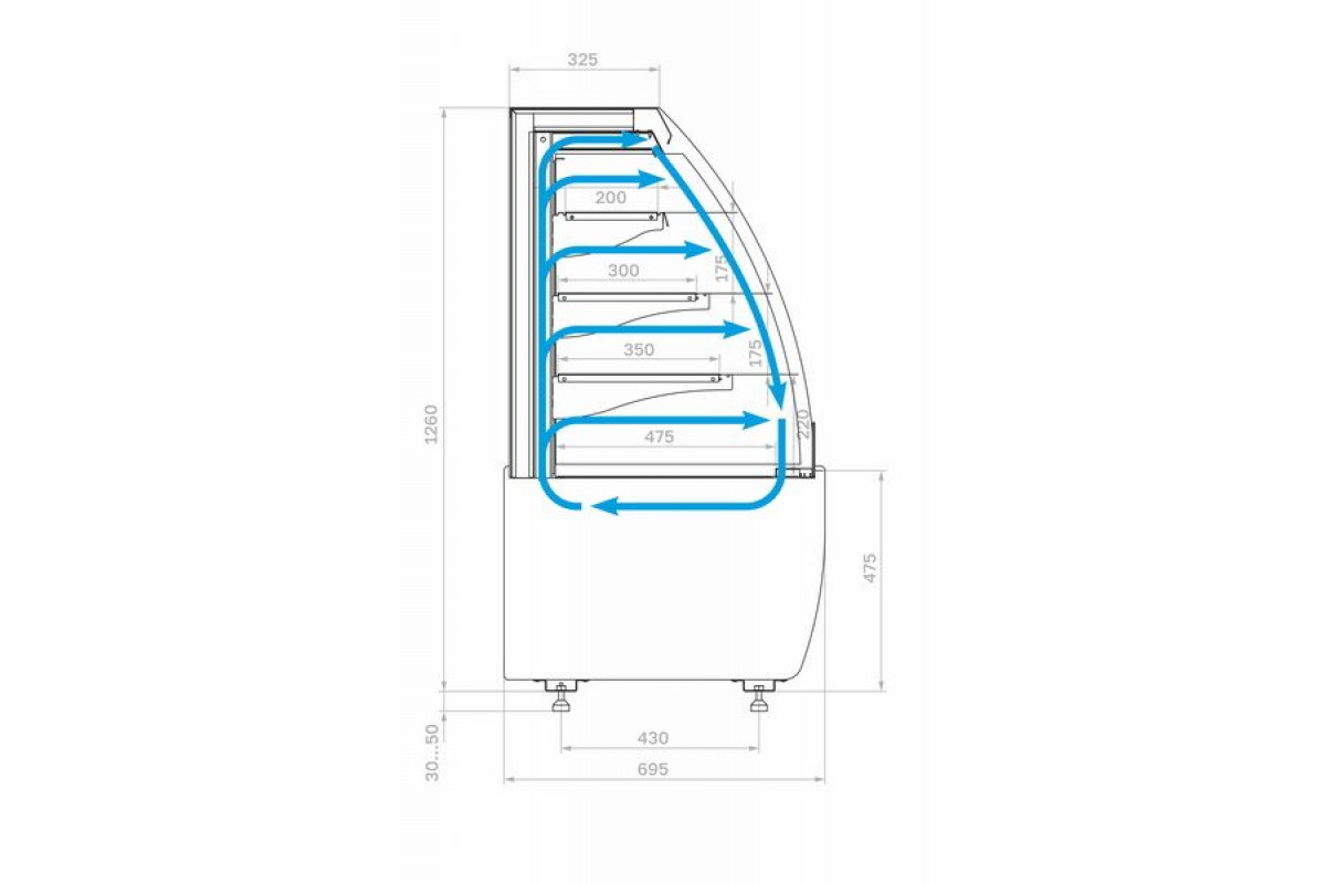 - Глубина выкладки 475 мм + 3 полки (350 мм + 300 мм +200 мм);