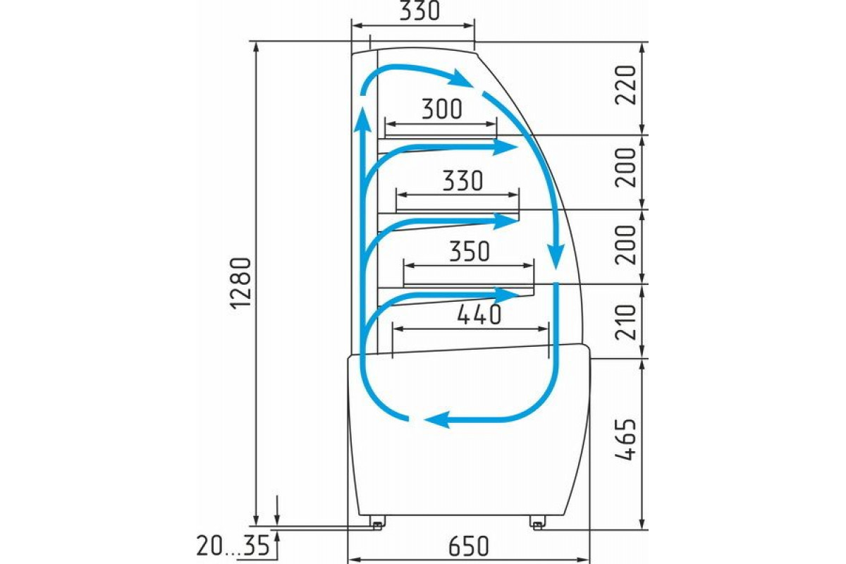 - глубина выкладки 440 мм + 3 полки с LED подсветкой каждая: 350 мм, 330 мм, 300 мм;