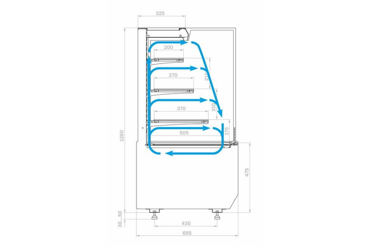 - Глубина выкладки базовой полки 505 мм + 3 полки с глубиной выкладки - 370 мм, 270 мм, 200 мм);