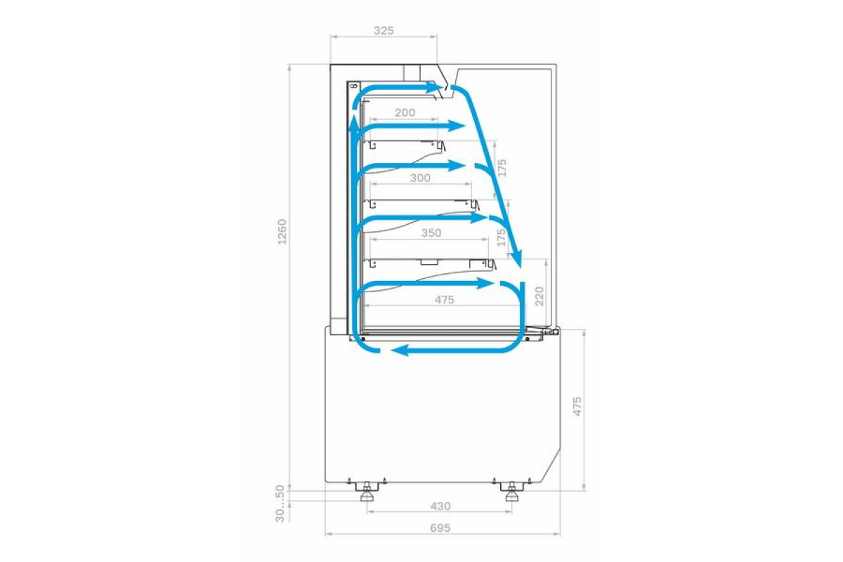 - Глубина выкладки базовой полки 475 мм + 3 полки с глубиной выкладки - 350 мм, 300 мм, 200 мм);