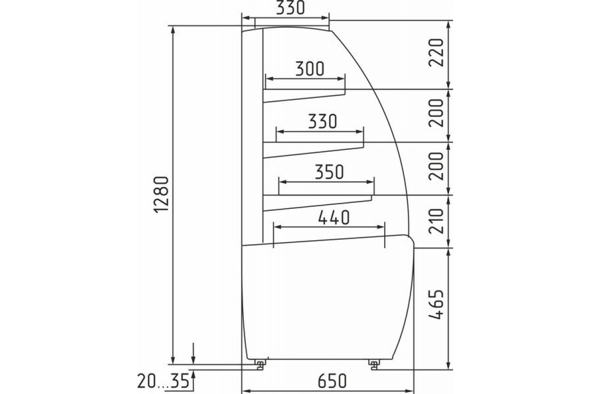 - Глубина выкладки 440 мм + 3 полки (350 мм, 330 мм, 300 мм);