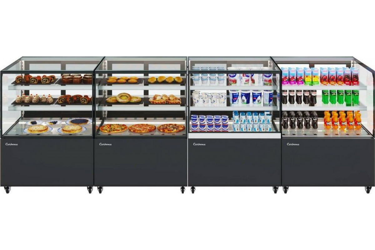 Витрина нейтральная напольная Carboma KC71-150 N 0,9-1 (9005) витрины COSMO идеально подходят для любой конфигурации помещений кондитерской, пекарни, кафе. Дают возможность легко менять и расширять концепцию, варьируя пространством и объёмом экспозиции продуктов. Ровные грани стеклопакетов и отсутствие соединительных планок во внешнем контуре остекления придают витринам легкость и эффект бесконечности.