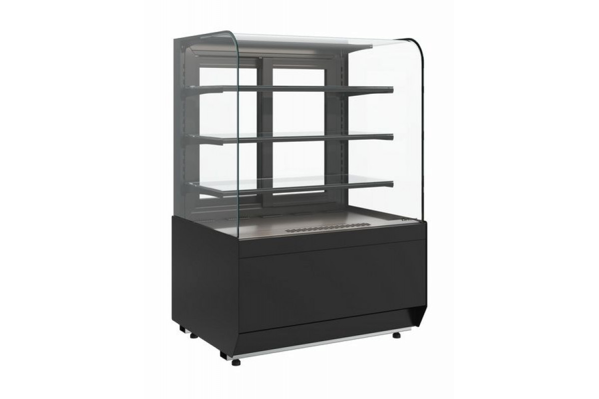 Витрина нейтральная напольная Carboma KR70 N 0,9-1 LIGHT (9005) предназначена для кратковременного хранения и демонстрации готовых блюд и напитков. Рекомендуется к применению в пекарнях, кондитерских, супермаркетах и на других предприятиях торговли и общественного питания. Модель оснащена 3-х сторонним радиусным безрамным остеклением и раздвижными задними створками. Радиусное фронтальное стекло обеспечивает полный обзор продукции на всех полках, а также позволяет создать торговый ряд без стыков.
