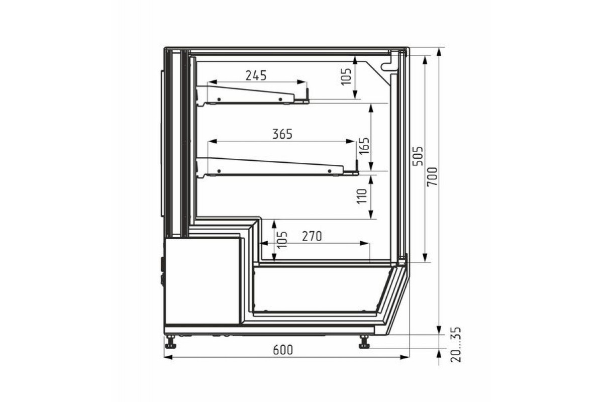- Глубина выкладки 270 мм + 2 полки: 365 мм и 245 мм;
