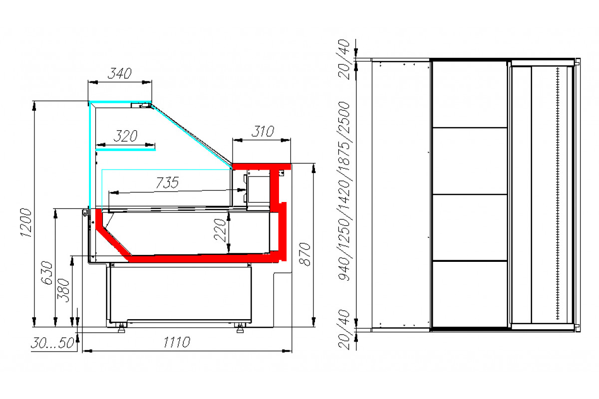 - 2х ступенчатые поддоны для выкладки. Общая высота поддона -120 мм, общая глубина - 480 мм;