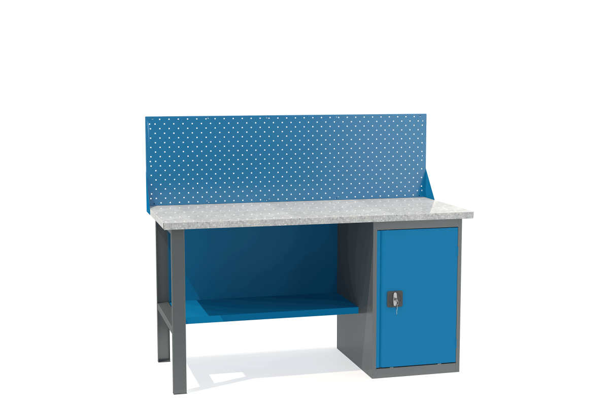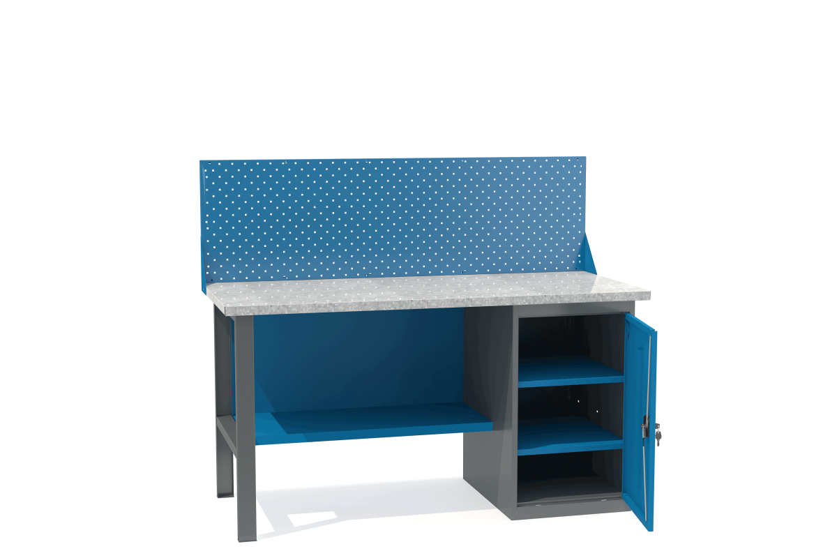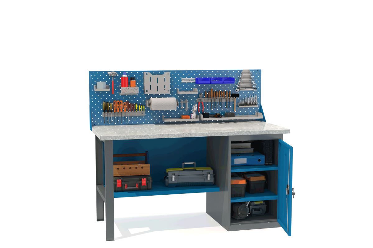 - Верстак укомплектован тумбой с полками.