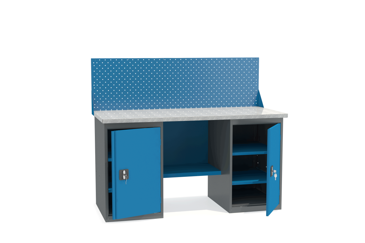 - Верстак имеет надежную модульную конструкцию с усиленной столешницей (плита МДФ 25мм, покрытая листом оцинкованного металла).